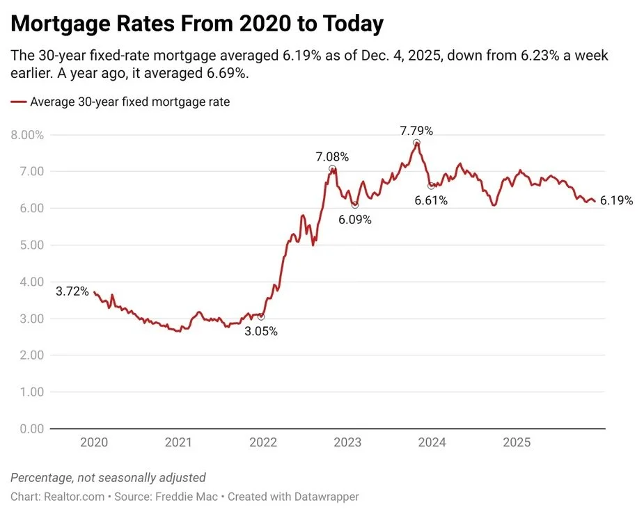 Mortgage rates on a 30-year fixed loan fell again, averaging 6.19% for the week ending Dec. 4, Freddie Mac reports — down from 6.69% at the same time last year.